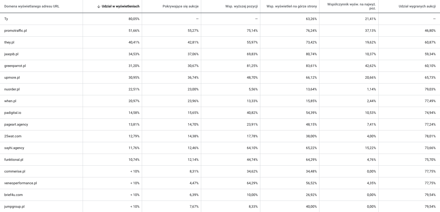 - Regularnie analizuj dane aukcji – spadek % wyświetleń można przypisać nowym uczestnikom aukcji lub konkurentom, którzy podnoszą wyższe stawki. Zalecamy regularne zapoznawanie się z tym raportem, aby lepiej zrozumieć zachowanie konkurencji.