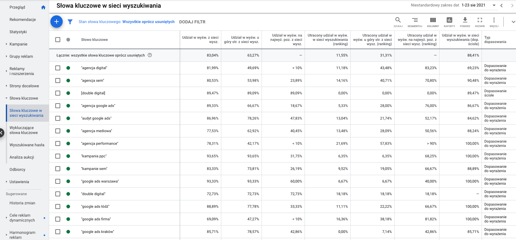 Podsumowując, dane Google Ads dotyczące udziału w wyświetleniach stanowią jeden z najskuteczniejszych sposobów analizy i zrozumienia konkurencji i skuteczności naszych kampanii Google Ads. Z tego powodu zalecamy jak największą widoczność słów kluczowych (grup lub kampanii) spełniających cele biznesowe i regularne monitorowanie danych o udziale w wyświetleniach, dokonywanie korekt budżetowych lub poprawianie Rankingu. Każde utracone wyświetlenie to stracona szansa na wygenerowanie ruchu i klientów, a co za tym idzie dodatkowych zysków.