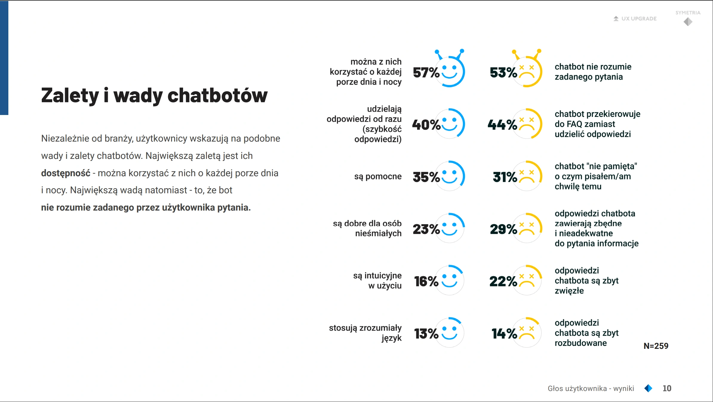 Poniżej przedstawiamy wyniki sondażu dot. opinii na temat funkcjonalności chatbotów. Wyniki badań nt. zalet i wad chatbotów na podstawie opinii użytkowników.