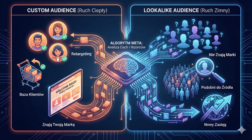 Czym różni się Custom Audience od Lookalike Audience? Custom Audience (Grupa Niestandardowa) to osoby, które już znają Twoją markę – odwiedziły stronę, kupiły produkt lub są na liście mailingowej. Lookalike Audience (Grupa Podobnych Odbiorców) to zupełnie nowi ludzie, którzy Cię nie znają, ale algorytm ocenia ich jako bliźniaczo podobnych do Twojej grupy Custom.