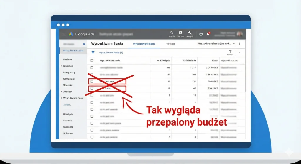 To metoda dla zaawansowanych, ale w branżach o CPC rzędu 50 zł (np. finanse, prawo) potrafi oszczędzić tysiące złotych miesięcznie.